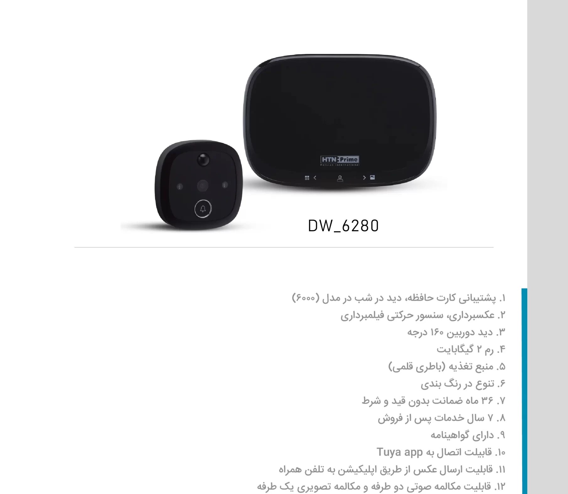 با پیشرفت تکنولوژی و تمایل بیش از پیش انسانها به استفاده از آن برای راحتتر کردن زندگی، استفاده از محصولات هوشمند همانند چشمی هوشمند، دستگیره هوشمند و … رونق یافته است. چشمی دیجیتال DW6280 Proمحصول جدید اچ تی ان پرایم است که بر روی درب نصب شده و دیگر نیازی نیست برای دیدن پشت درب، چشممان را به آن بچسبانیم و از سوراخ چشمیهای قدیمی شخص پشت درب را ببینیم. کافیست به مانیتور 140*100 میلیمتری چشمی نگاه کنیم و درب را برای شخص پشت آن باز کنیم. این محصول برای بالا بردن امنیت منازل و محل کار استفاده میشود و تا حدی عملکرد آن شبیه دوربینهای مدار بسته است. چشمی هوشمند DW6280 Pro به اپلیکیشن Tuya متصل میشود و قابلیت مکالمه صوتی دو طرفه و تصویری یک طرفه را دارد. همچنین میتواند عکسها را برای اپلیکیشن متصل به تلفن همراه شما ارسال کند. قابل ذکر است که این چشمی قابلیت دید در شب دارد و زمانی که نور فضا کافی نباشد هم قابل استفاده است و تصاویر با کیفیتی از طریق صفحه نمایش با شما به اشتراک میگذارد. حافظه داخلی این چشمی دیجیتال بسته به نیاز شما از 1 تا 32 گیگابایت قابل ارتقا میباشد و منبع تغذیه آن باتری لیتومی قابل شارژ است که هر وقت سطح آن از حد مجازی پایینتر باشد، آلارمی بر روی اپلیکیشن و صفحه نمایش دریافت میکنید. در ضمن به منظور راحتتر شدن کارکرد منو به زبان فارسی و به همراه یک رم GB32 در خدمت مشتریان عزیز اچتیان پرایم قرار میگیرد. ضمانت 36 ماهه و ۷ سال خدمات پس از فروش این مدل دستگیره، سندی بر کیفیت بالای محصول میباشد.