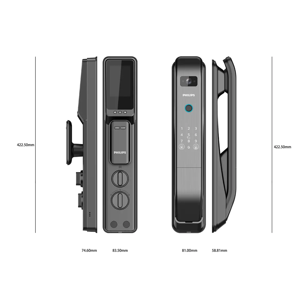 دستگیره هوشمند فیلیپس DDL303-VP-5HWS مجهز به صفحه نمایش 3.5 اینچی است که به راحتی میتوانید ببینید چه شخصی پشت درب است. وجود دوربین و بلندگو با کیفیت که تصاویر و صدا را به راحتی و با کیفیت بالا منتقل میکند، این دستگیره را از سایر دستگیرههای هوشمند فیلیپس متمایز کرده است. ظاهر خاص و زیبای آن و وجود یک اهرم مکانیکی در پشت دستگیره به جذابیت این قفل هوشمند افزوده است.سیلندر این دستگیره از سری سیلندرهای بانکی با امنیت بالاست که خیال شما را بابت بالاتر بردن امنیت راحت میکند و نیازی نیست که به صورت جداگانه قفل و سیلندر تهیه نمایید. باز شدن این دستگیره دیجیتالی از بیرون از طریق تگ، رمز عبور، کلید مکانیکی و اثر انگشت محقق میشود و شما میتوانید قابلیت باز شدن دو مرحلهای را نیز فعال کنید. باز شدن از داخل نیز توسط اهرم مکانیکی و دکمه open انجام میشود. این دستگیره هوشمند به تلفن همراه شما متصل میشود و قابلیت ارسال رمز عبور یکبار مصرف دارد. همچنین شما میتوانید از طریق اپلیکیشن ترددها را کنترل نمایید. این قابلیت برای مکانهایی که نیاز به امنیت بالایی دارد بسیار کاربردی است.شما میتوانید برای درخواست نصب با کارشناسان با در ارتباط باشید .
