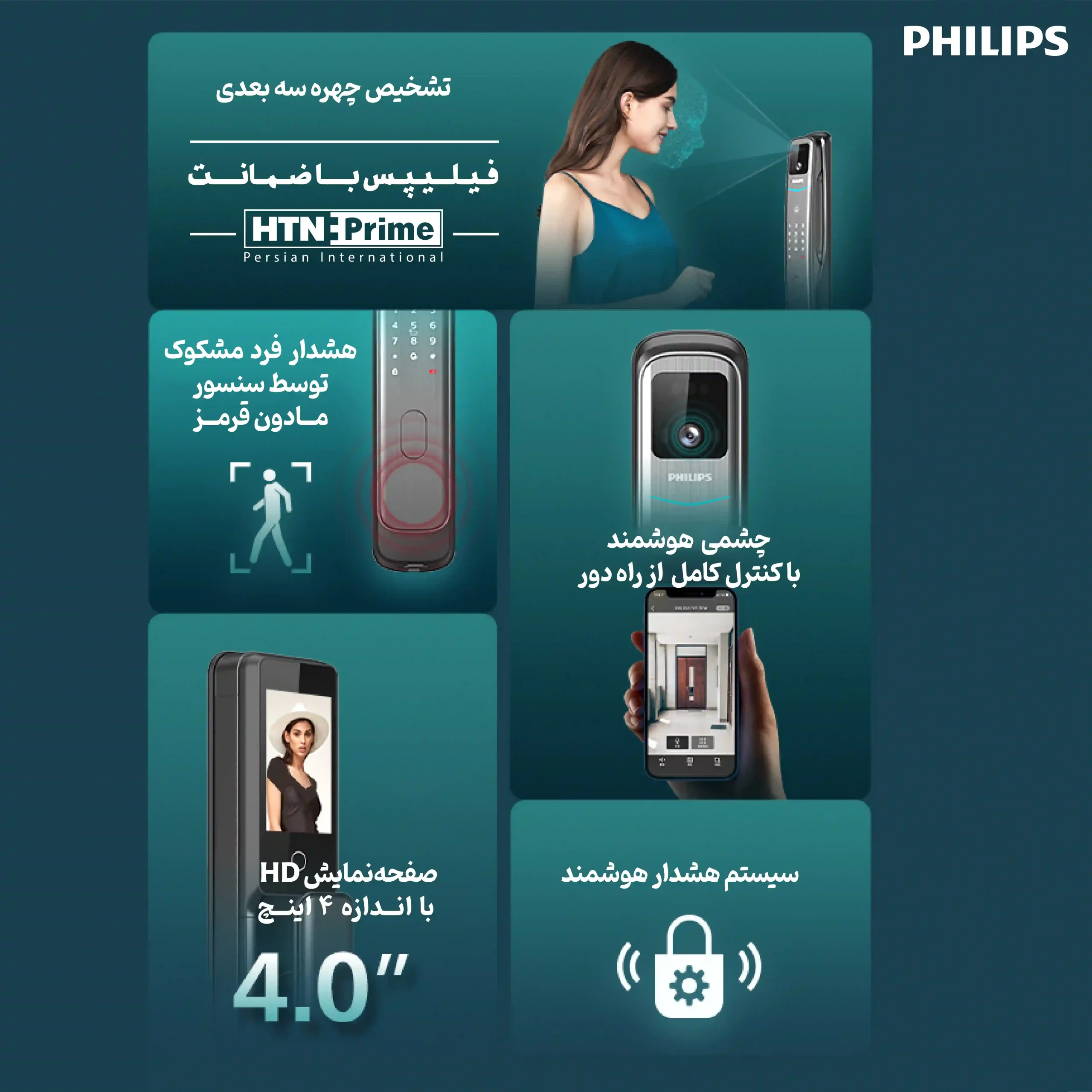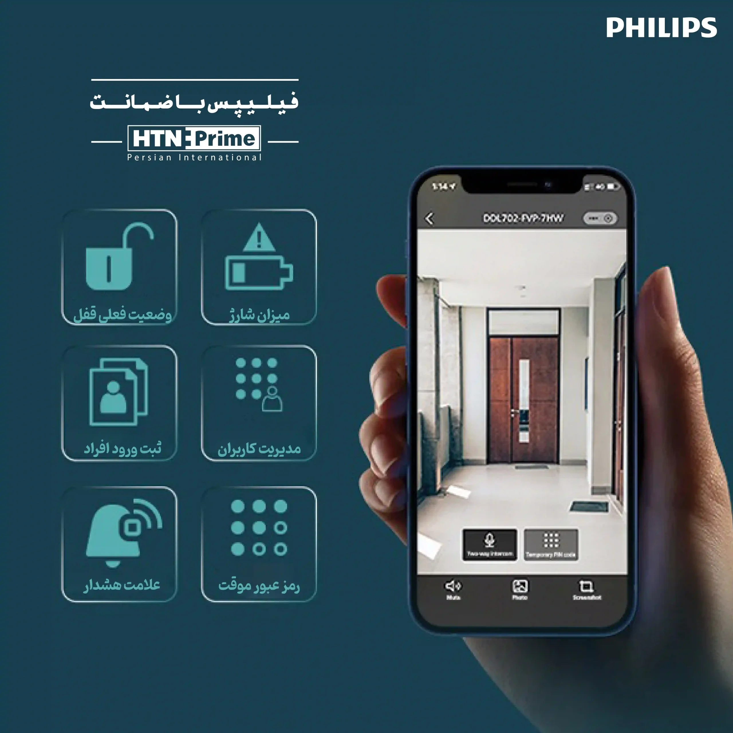 امکانات آفلاین : قابلیت ذخیره 270 کاربر (رمزعبور ، اثرانگشت ،کارت) بازشدن با اثرانگشت 100 کاربر باز شدن با رمز عبور 20 کاربر باز شدن با کارت یا تگ 100 کاربر بازشدن با تشخیص چهره 50 کاربر باتری Li-Polymer دوربین رنگی و دید در شب مانیتور رنگی داخلی 4اینچ با رزولوشن 480P زنگ درب شب بند احراز هویت دو مرحله ای هشدار در صورت ورود اثرانگشت،رمزعبور،چهره،کارت یا تگ نامعتبر هشدار ضعیف بودن باتری منبع تغذیه اضطراری سنسور تشخیص بدن انسان(PIR) هشدار سرقت در صورت اقدام به جداسازی دستگیره از درب امکانات آنلاین : پروتکل اتصال: wifi قابلیت مشاهده میزان درصد باتری دستگیره بر روی موبایل فیلم برداری از فرد در صورت زنگ زدن ارسال نوتیفیکیشن در صورت تردد افراد ناشناس جلوی درب هشدار سرقت